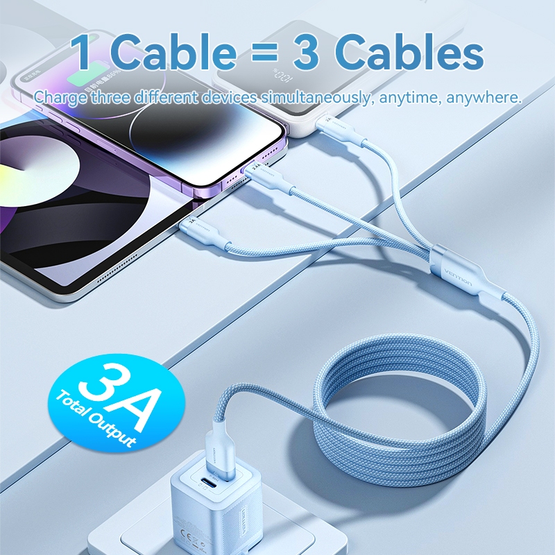 Vention USB 2.0 A Male to 3-in-1 USB-C & Lightning & Micro-B Male 3A Cable 1.5M 480Mbps Aluminum Alloy Type for iPhone/Samsung/Power Bank