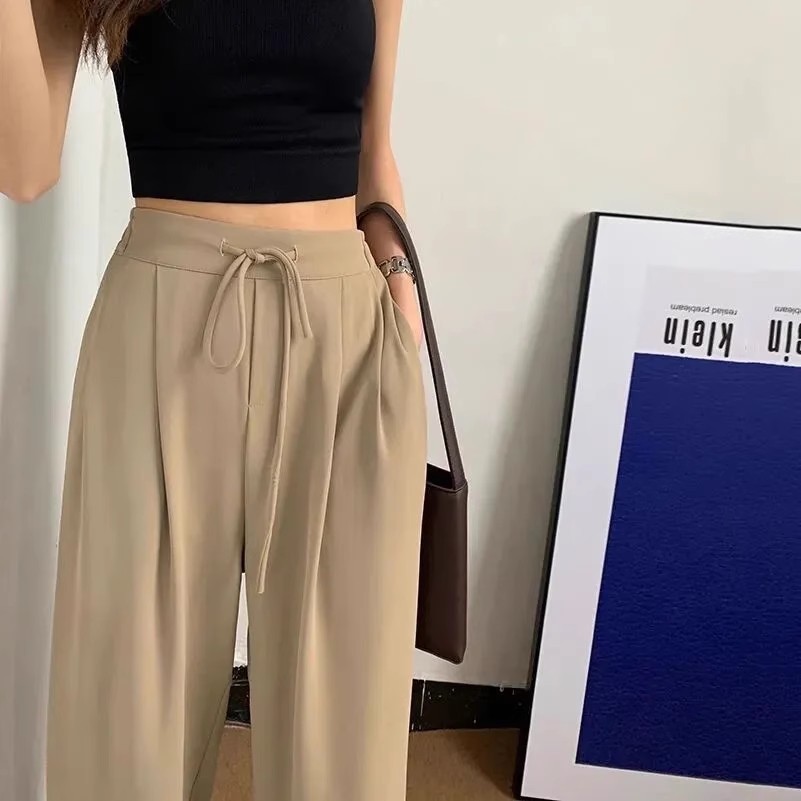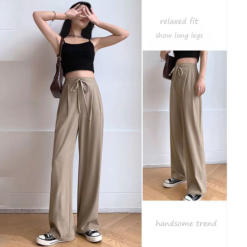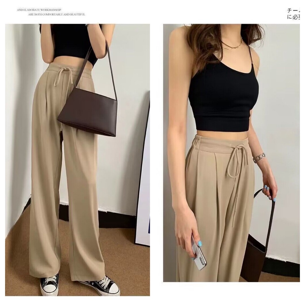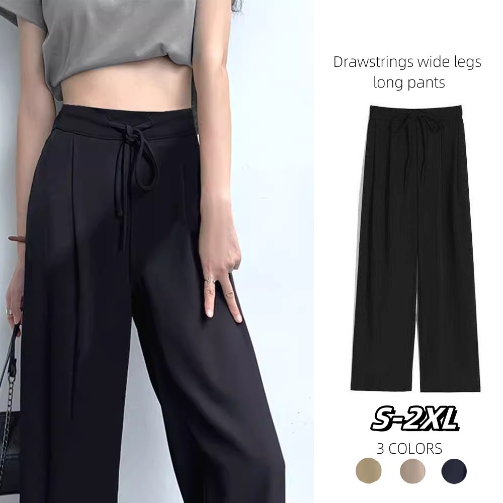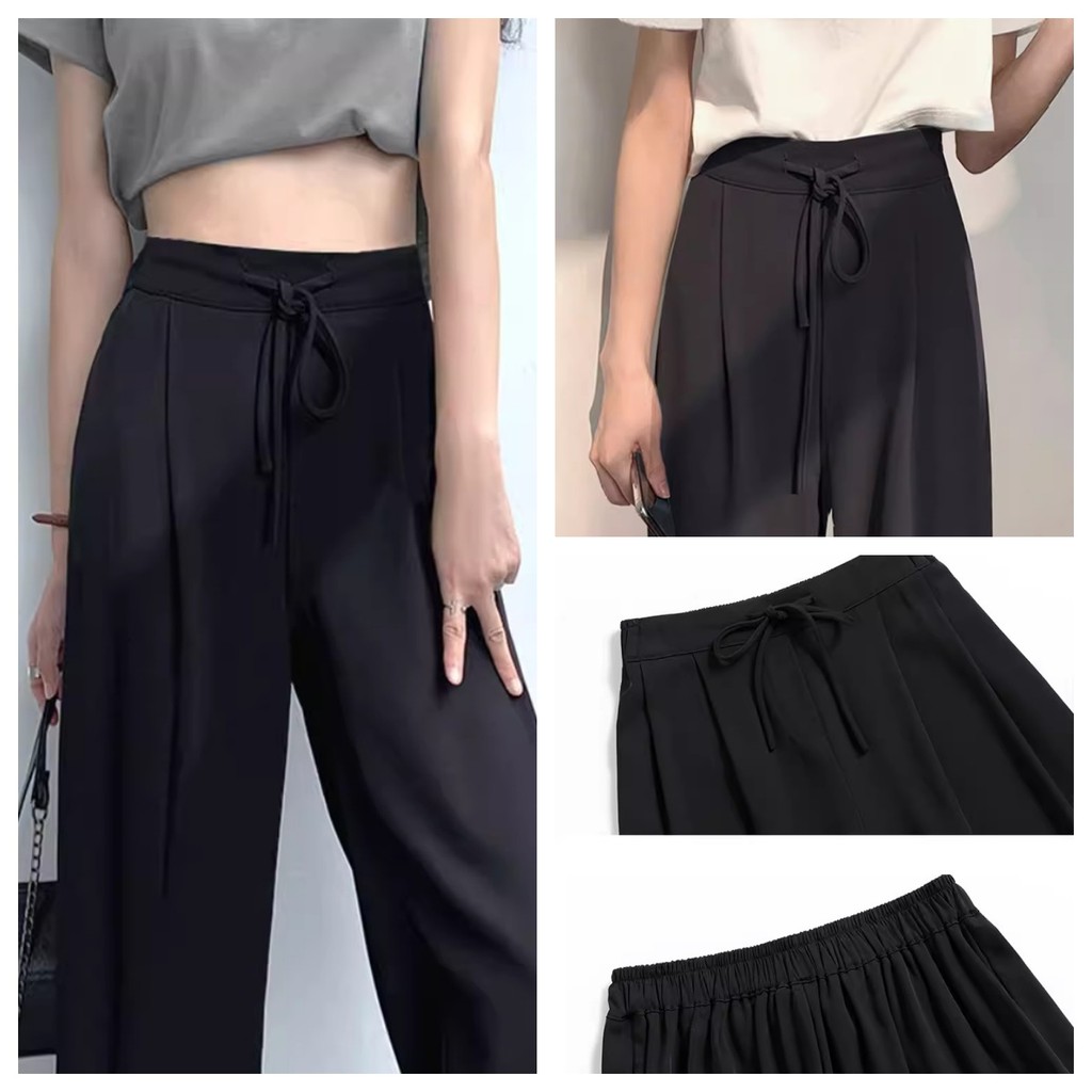 {Shipped From Manila+COD} Black Long Pants for Women High Waist Elastic Waist Drawstrings Solid Color Pockets Straight Vertical Wide Leg Full Length Long Trousers All Match