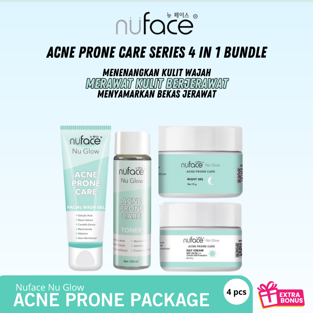 Nuface Skincare 4 In 1 Bundle Nuglow Acne Prone Care Series | Facial Wash, Toner, Day Cream, Night Gel | Acne Skincare Package