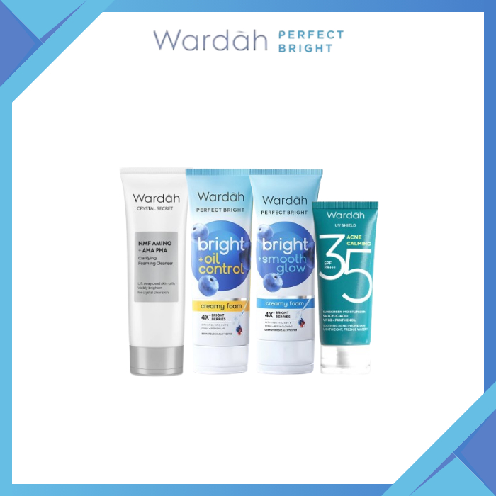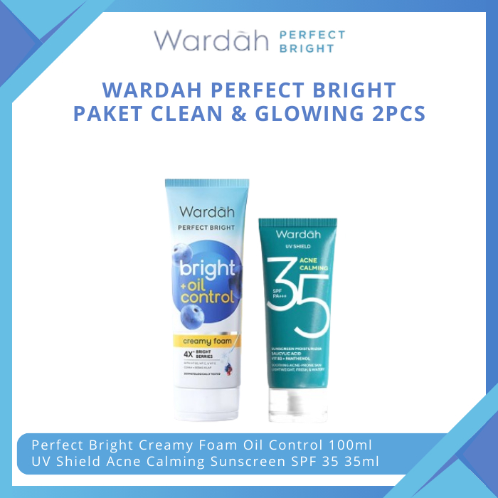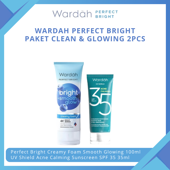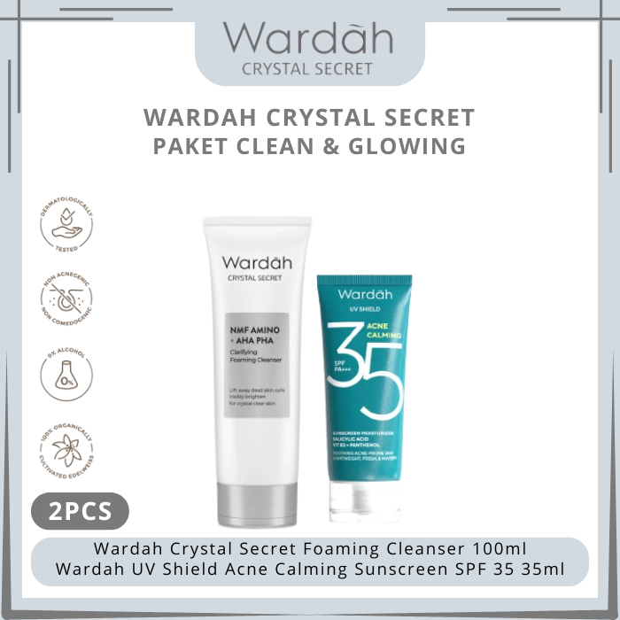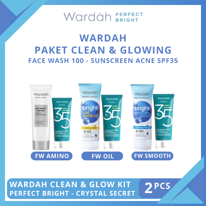 Wardah Clean & Glowing Package 2pcs - Sunscreen Acne Calming Spf35, Face Wash CS Amino 100, Face Wash PB Oil Control Smooth Glowing