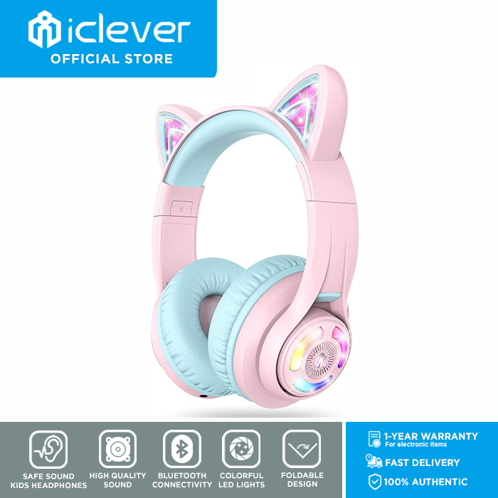 iClever BTH13 Cat Ear Kids Bluetooth Headphones, Safe Sound, LED Light Up Over Ear Kids Wireless