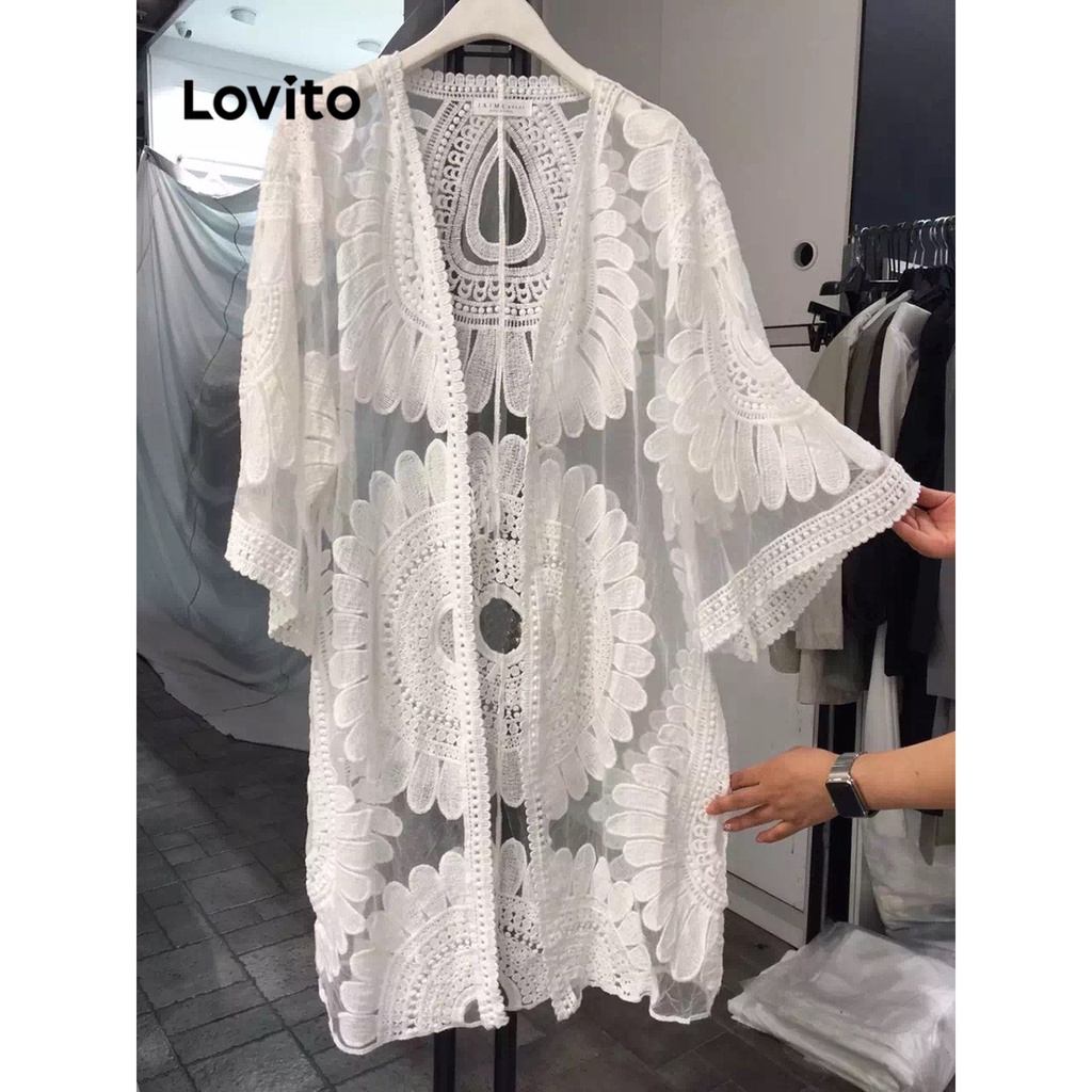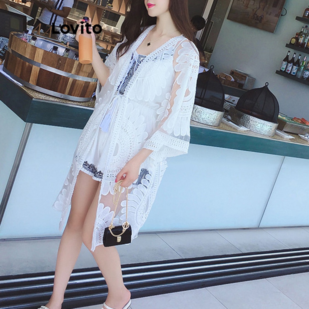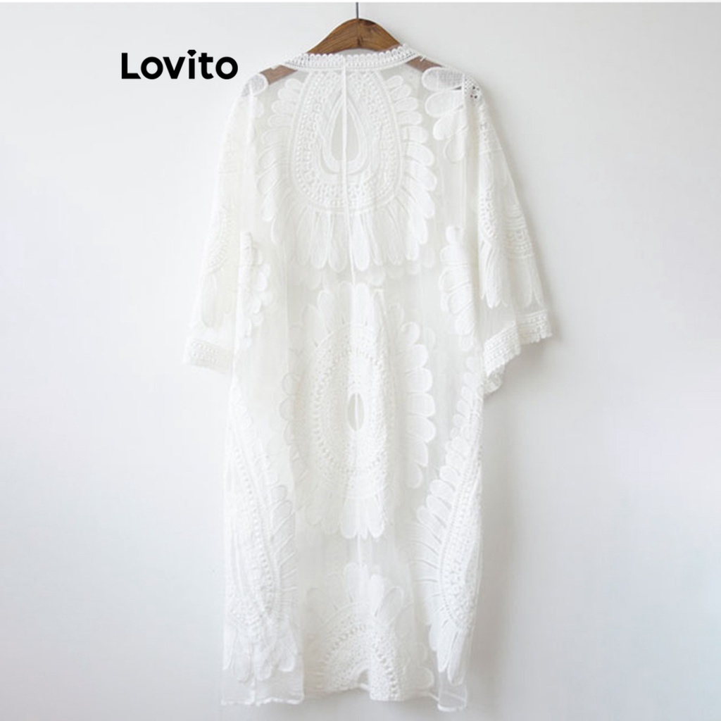 Lovito Casual Plain Lace Kimono for Women LNE30232 (White)