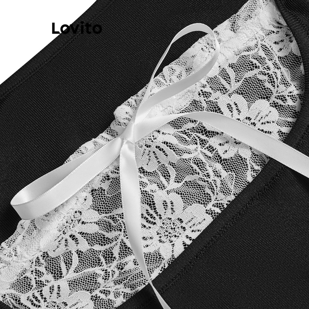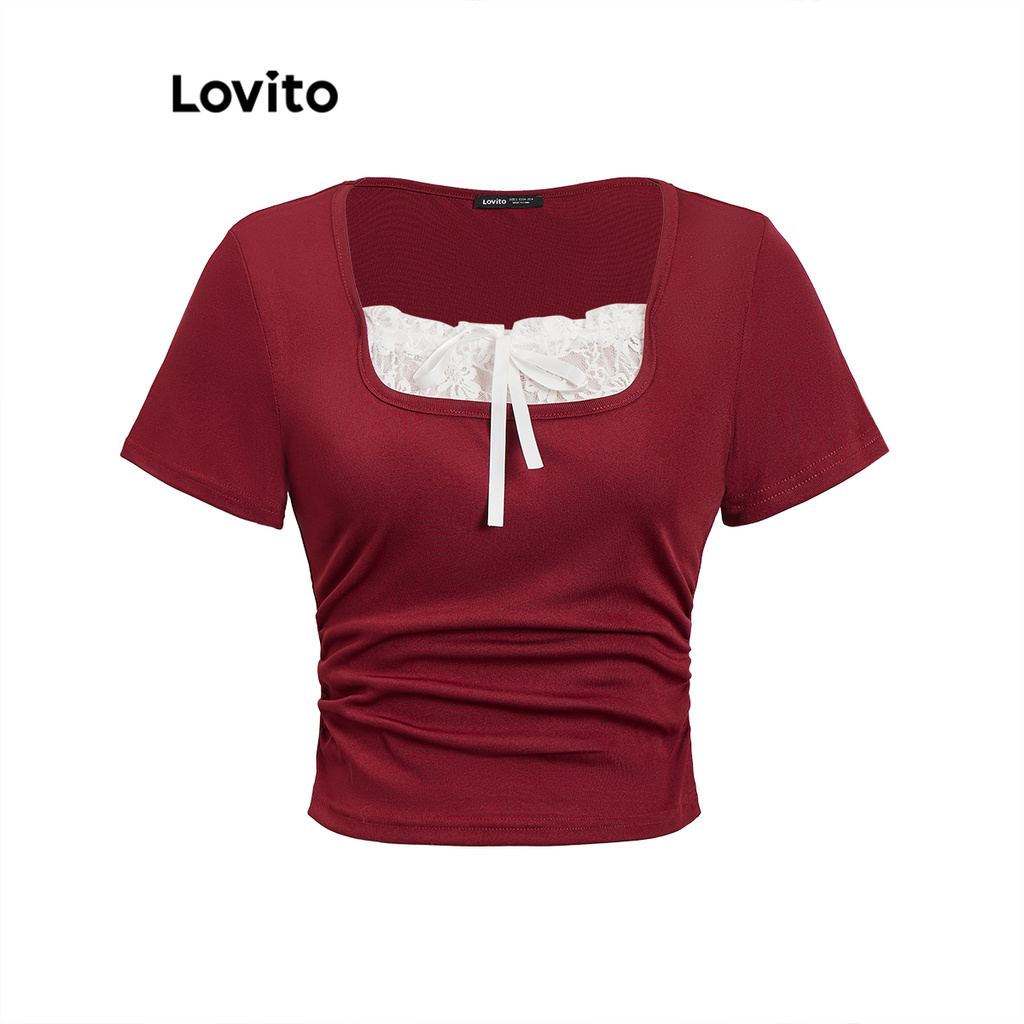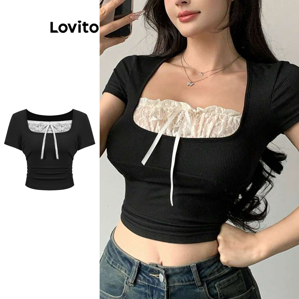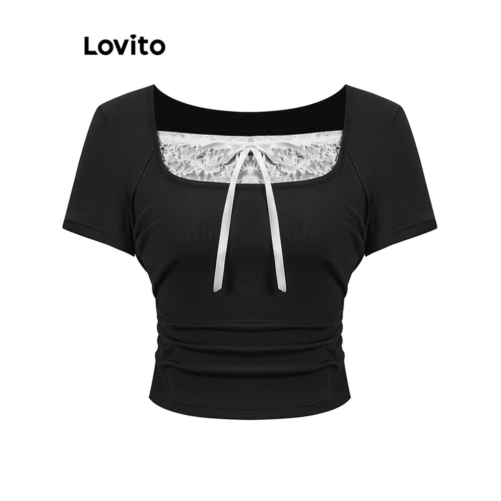 Women Cute T-Shirt Plain Lace Bow Fabric Stitching T-Shirt L90AD007 (Multi-color)