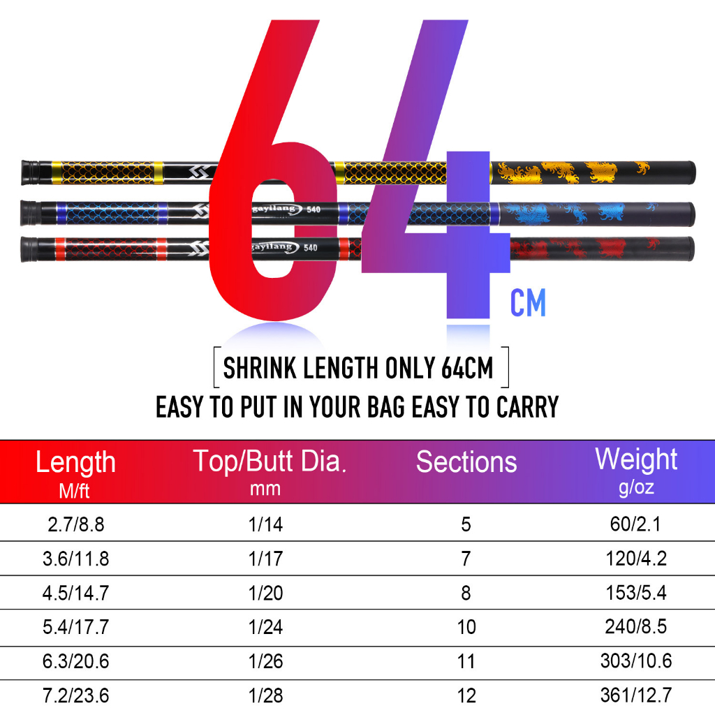 Sougayilang 2.7m 3.6m 4.5m 5.4m 6.3m 7.2m Telescopic Fishing Rod 3 Color Max Drag 8kg