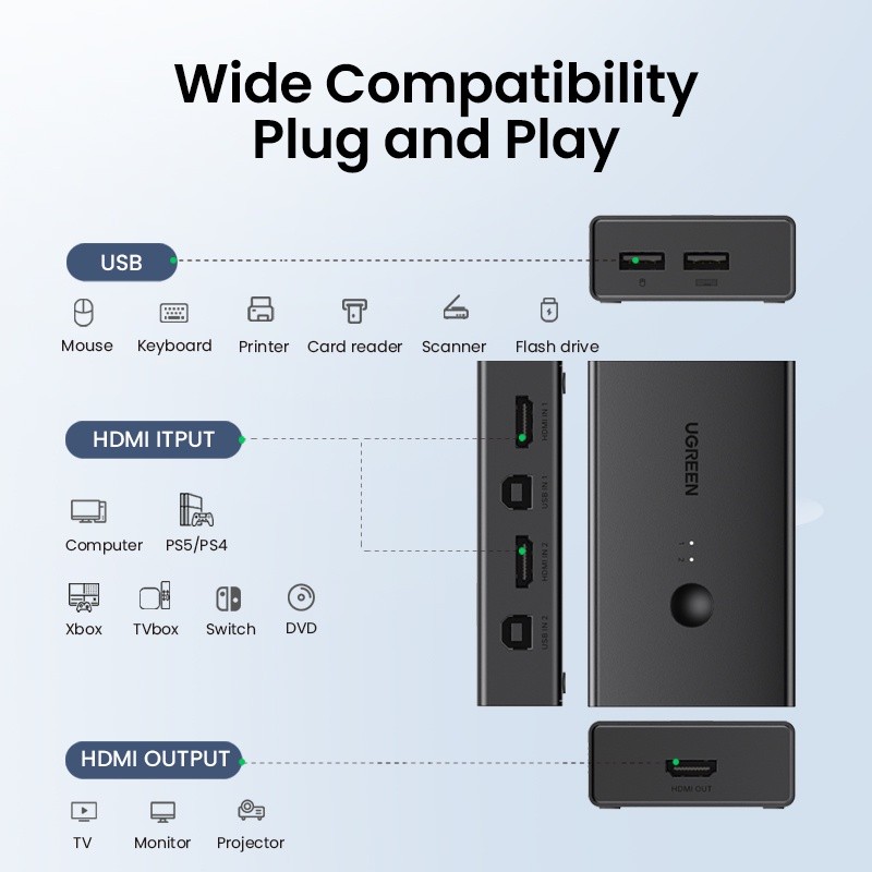 UGREEN 4K60Hz HDMI KVM Switch 2 IN 1 OUT Ultra HD HDMI Switcher Box For Sharing Monitor