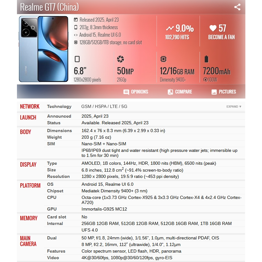 Realme GT7/GT7 Pro Dual SIM IP68/IP69 6.78 inches 1264 x 2780 pixels Snapdragon 8 Elite (3 nm)