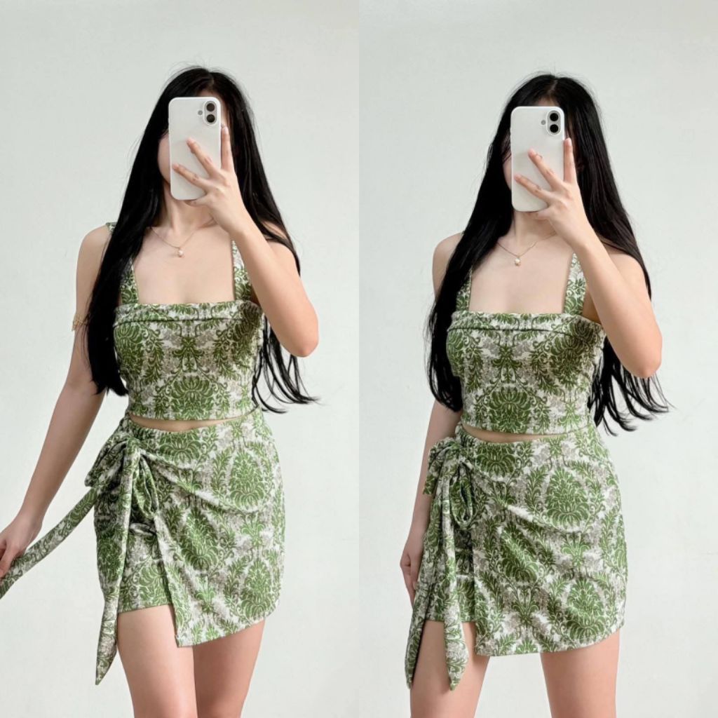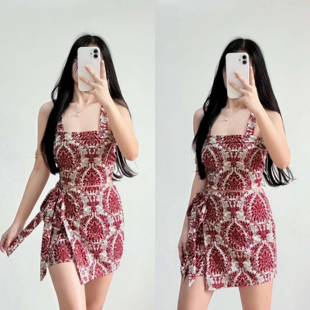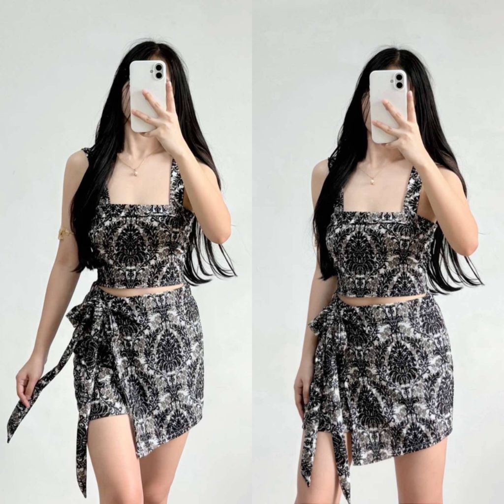 XC ARIANE TERNO Patterned Crop Top & Skirt Set with Tie Waist for Women