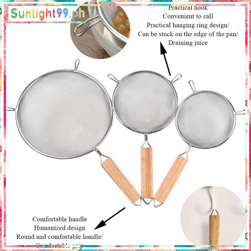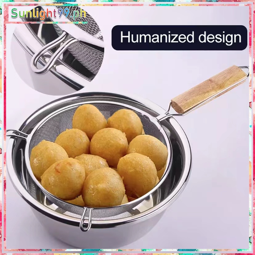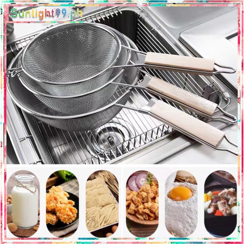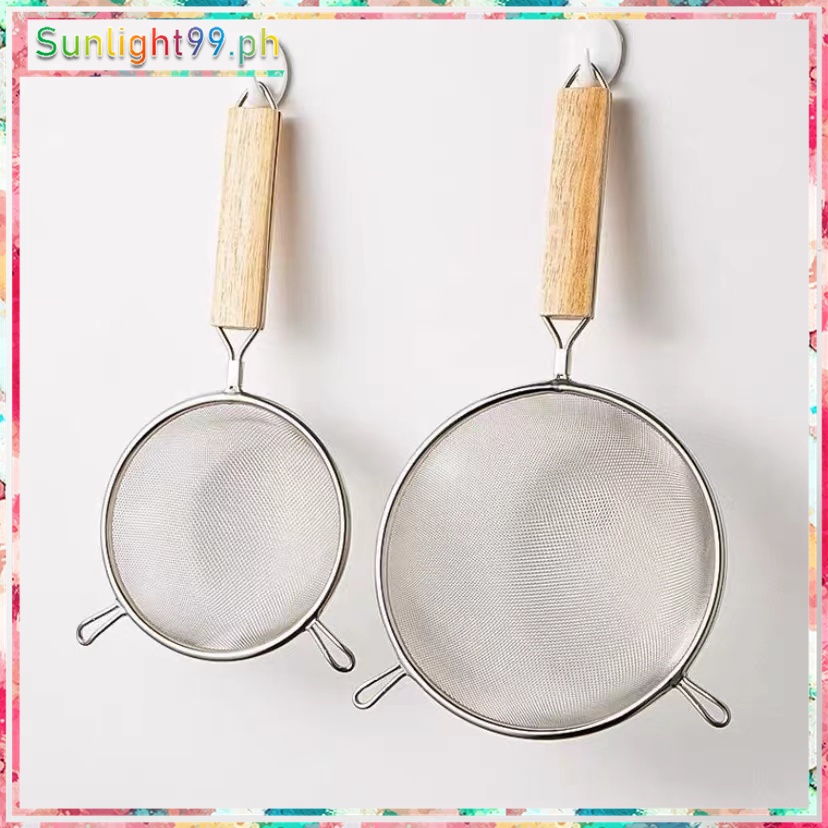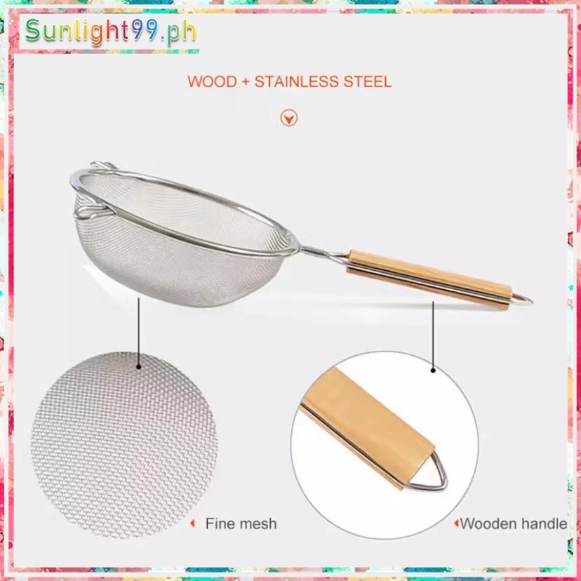 stainless steel double mesh strainer sifter sieve for kitchen food drainer with wooden handle